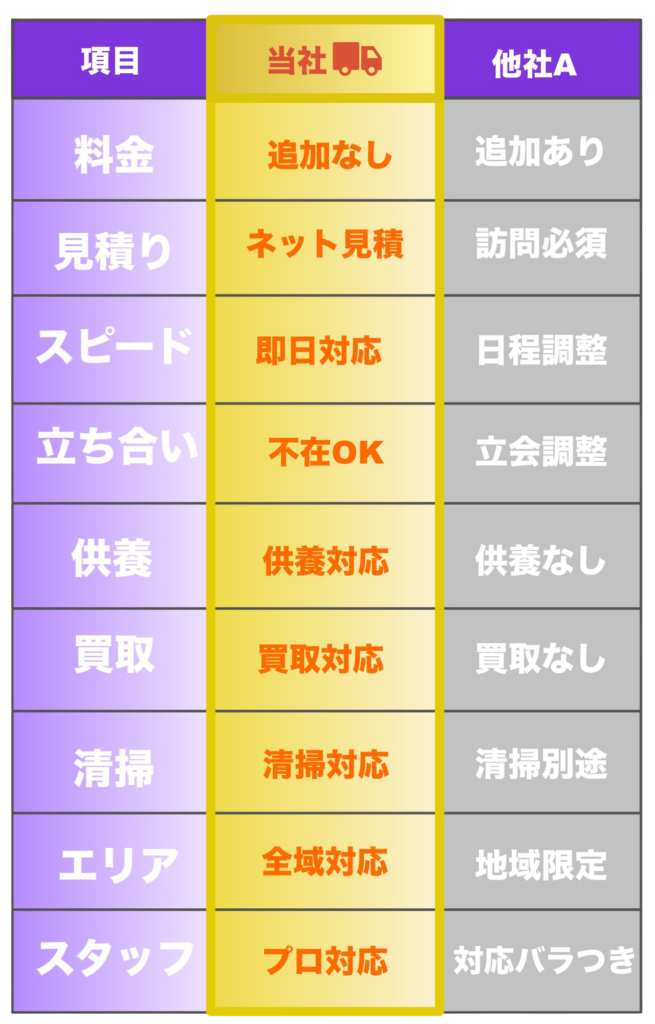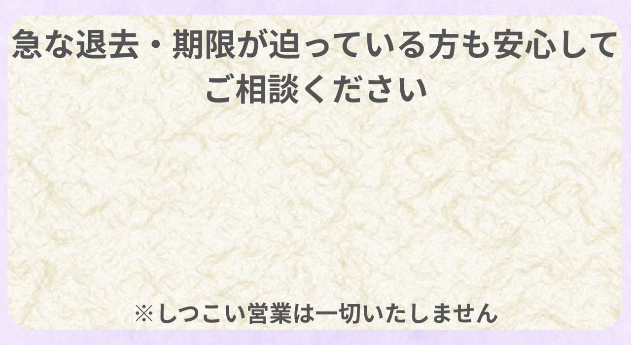 お部屋の広さや家財の量、搬出条件などを確認したうえで、わかりやすくご案内いたします。お見積もり後に無理な営業を行うことはありませんので、安心してご相談ください。