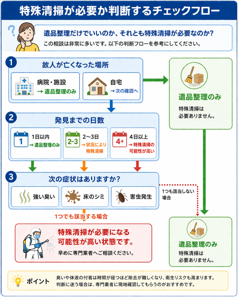 「遺品整理だけでいいのか、それとも特殊清掃が必要なのか」