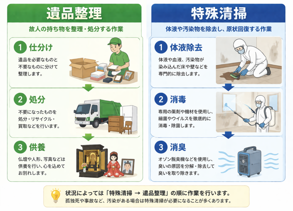 遺品整理と特殊清掃は目的がまったく違う作業です。